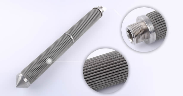 采用不銹鋼纖維燒結(jié)氈作為核心過濾層,該燒結(jié)氈過濾層主要材料為直徑1~80μm的細長纖維,將這些金屬纖維均勻鋪放,形成三維結(jié)構(gòu)的費編織網(wǎng),在經(jīng)過高溫燒結(jié),纖維便在接點處固定,從而形成了整體優(yōu)良的過濾材料。