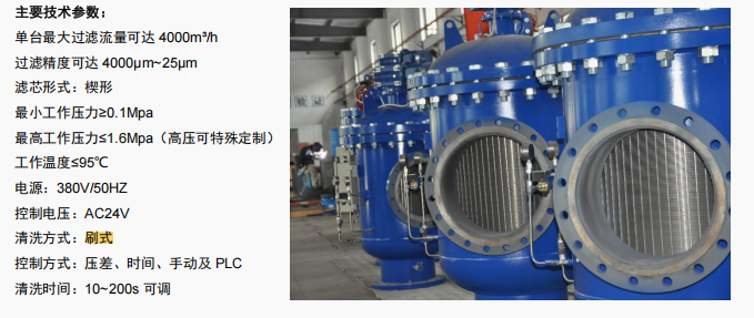 不間斷供水:清洗時水量極少,小于出水量的 1%,沖洗時間 為 215 秒,整個系統(tǒng)不間斷流; 過濾精度高:過濾精度最高可達到 25 微米,有各種精度的濾網(wǎng) 供您選擇; 過濾面積大:標準濾網(wǎng)有效過濾面積是入口面積的 740 倍; 清洗可靠:有多種控制方式,手動、壓差、時間、PLC 程序邏 輯控制等選擇; 安裝經(jīng)濟簡單:結(jié)構(gòu)形式多樣,適合于現(xiàn)場各種情況安裝,而 不影響運行效果。