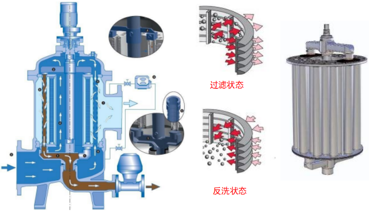 待過濾的污水由過濾器下部進(jìn)入殼體,由下而上通過花盤進(jìn)入濾芯的內(nèi)腔,再通過濾芯向外流出,過濾后得到的凈水 由過濾器上部的出水口流出,固體雜質(zhì)被截留在濾芯的內(nèi)側(cè), 當(dāng)進(jìn)行反沖時,無須切斷進(jìn)水水流馬達(dá)驅(qū)動濾芯吸盤 轉(zhuǎn), 同時打開反沖排污閥。每個濾芯依次經(jīng)過過濾后的凈水進(jìn)行反沖洗。